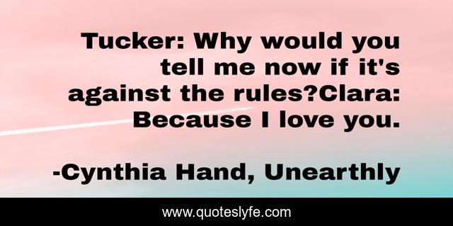 This page presents the quote "Tucker: Why would you tell me now if it's against the rules?Clara: Because I love you.". Author of this quote is Cynthia Hand, Unearthly. This quote is about revelation, sorry, love, affection,.