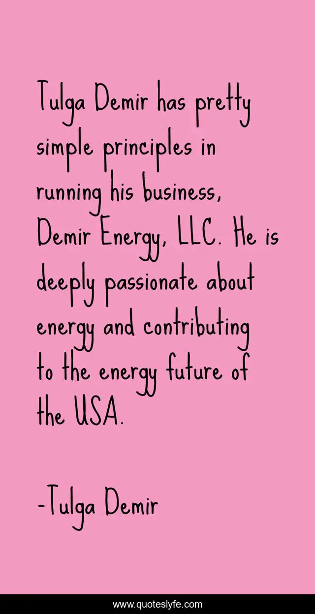 This page presents the quote "Tulga Demir has pretty simple principles in running his business, Demir Energy, LLC. He is deeply passionate about energy and contributing to the energy future of the USA.". Author of this quote is Tulga Demir. This quote is about tulga-demir, entrepreneur, energy-industry,.