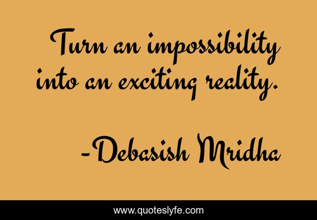 This page presents the quote "Turn an impossibility into an exciting reality.". Author of this quote is Debasish Mridha. This quote is about philosophy, debasish-mridha, reality, quotes, impossibility, inspirational, enthusiasm, exciting-reality, debasish-mridha-m-d,.