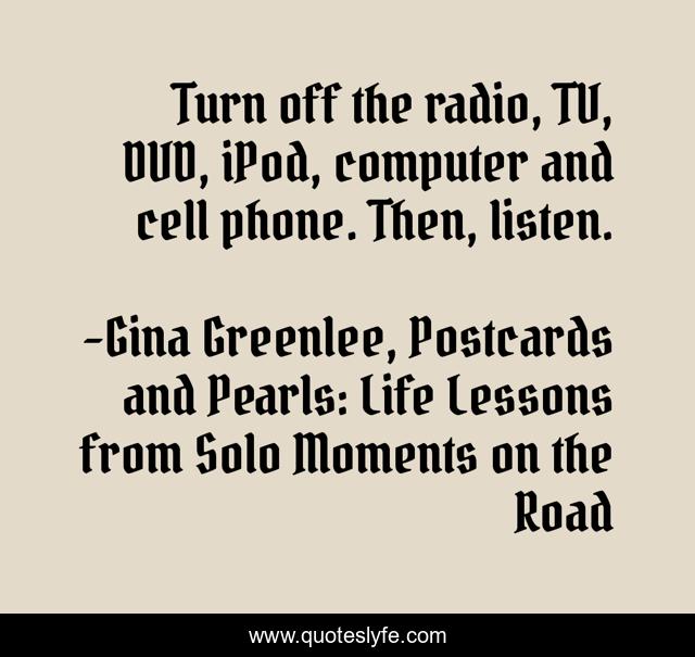 "Gina Greenlee, Postcards and Pearls: Life Lessons from Solo Moments on the Road Quotes." Quoteslyfe.com, 2025. Mon. 08 Dec. 2025. <https://www.quoteslyfe.com/quote/Turn-off-the-radio-TV-DVD-iPod-245273>.