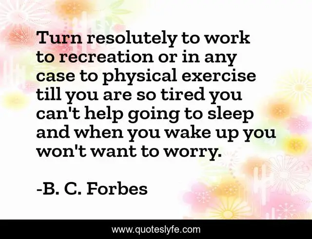 This page presents the quote "Turn resolutely to work to recreation or in any case to physical exercise till you are so tired you can't help going to sleep and when you wake up you won't want to worry.". Author of this quote is B. C. Forbes. .