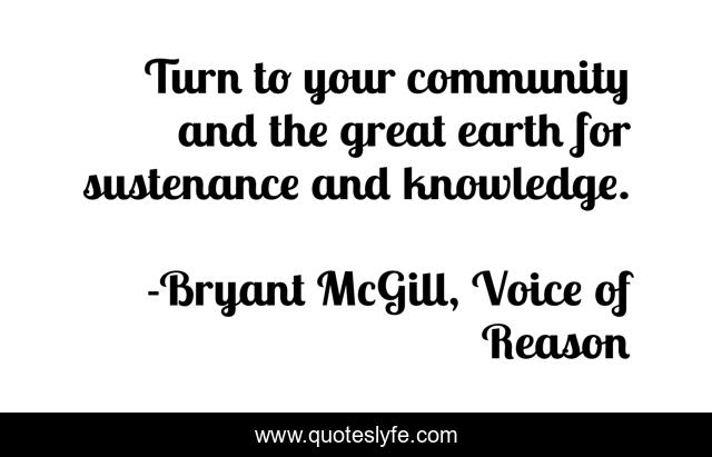 This page presents the quote "Turn to your community and the great earth for sustenance and knowledge.". Author of this quote is Bryant McGill, Voice of Reason. This quote is about society, looking-back, knowledge-acquisition,.
