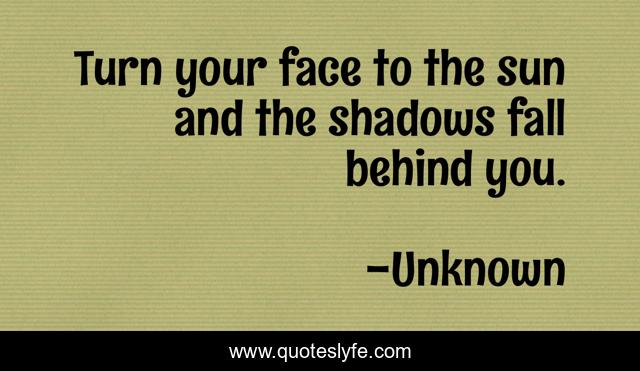 This page presents the quote "Turn your face to the sun and the shadows fall behind you.". Author of this quote is Unknown. This quote is about shadows, sun, fall,.