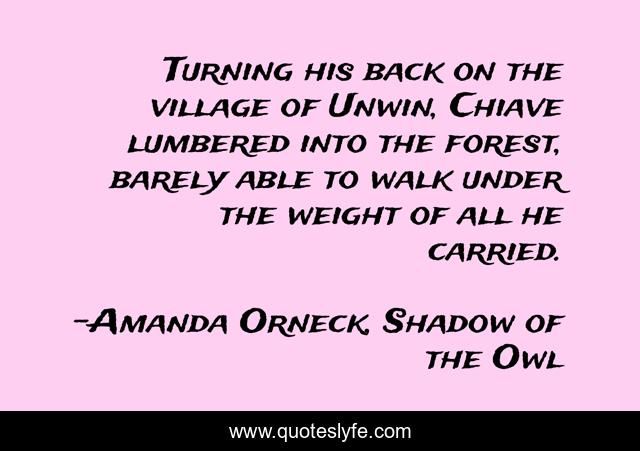 This page presents the quote "Turning his back on the village of Unwin, Chiave lumbered into the forest, barely able to walk under the weight of all he carried.". Author of this quote is Amanda Orneck, Shadow of the Owl. This quote is about foreshadowing, motovational, deep,.