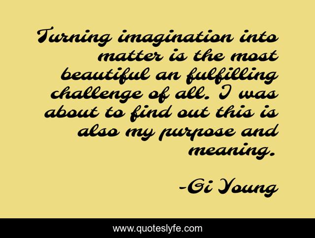 This page presents the quote "Turning imagination into matter is the most beautiful an fulfilling challenge of all. I was about to find out this is also my purpose and meaning.". Author of this quote is Gi Young. This quote is about imagination, meaning, purpose, transformation,.
