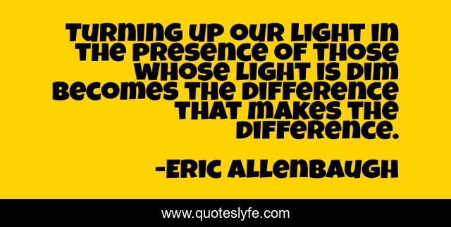 This page presents the quote "Turning up our light in the presence of those whose light is dim becomes the difference that makes the difference.". Author of this quote is Eric Allenbaugh. This quote is about making-a-difference, light, difference,.