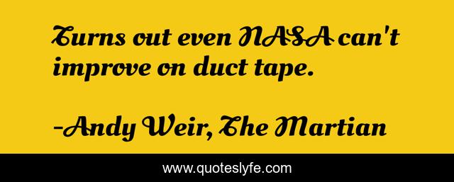 This page presents the quote "Turns out even NASA can't improve on duct tape.". Author of this quote is Andy Weir, The Martian. This quote is about repairs, nasa, humor, science,.