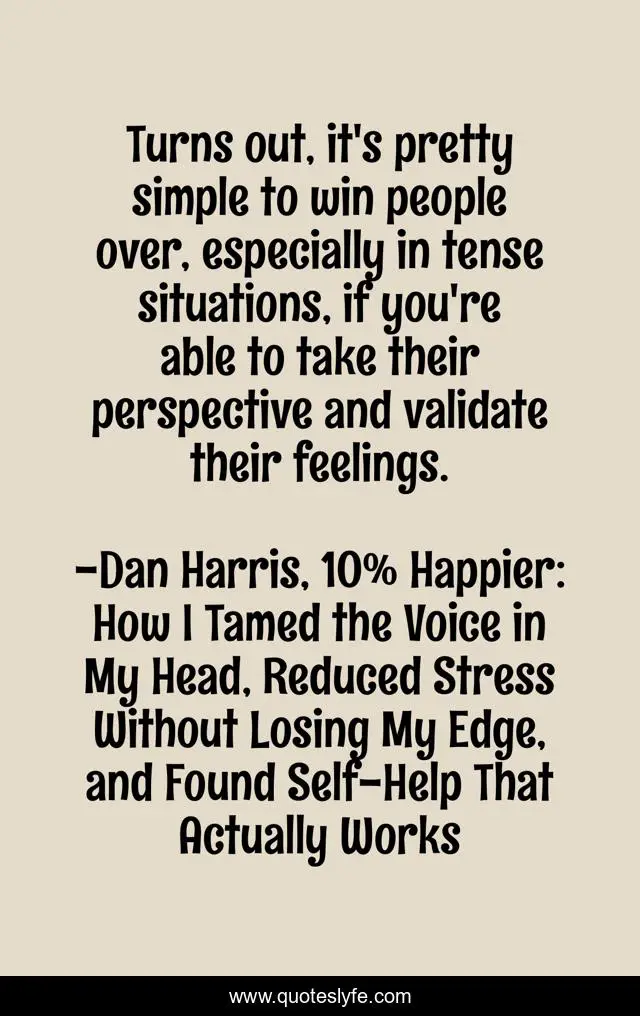 This page presents the quote "Turns out, it's pretty simple to win people over, especially in tense situations, if you're able to take their perspective and validate their feelings.". Author of this quote is Dan Harris, 10% Happier: How I Tamed the Voice in My Head, Reduced Stress Without Losing My Edge, and Found Self-Help That Actually Works. .