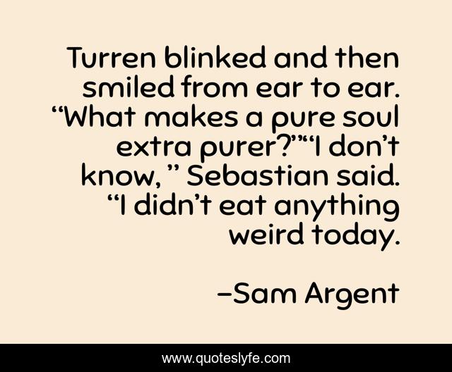 This page presents the quote "Turren blinked and then smiled from ear to ear. “What makes a pure soul extra purer?”“I don’t know, ” Sebastian said. “I didn’t eat anything weird today.". Author of this quote is Sam Argent. This quote is about humorous, oh-honey,.