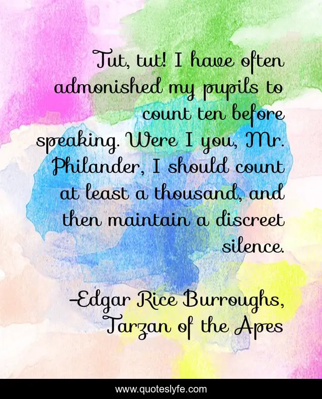 This page presents the quote "Tut, tut! I have often admonished my pupils to count ten before speaking. Were I you, Mr. Philander, I should count at least a thousand, and then maintain a discreet silence.". Author of this quote is Edgar Rice Burroughs, Tarzan of the Apes. This quote is about students, silence, speaking,.