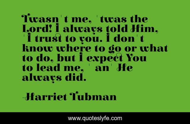 This page presents the quote "Twasn't me, 'twas the Lord! I always told Him, 'I trust to you. I don't know where to go or what to do, but I expect You to lead me, ' an' He always did.". Author of this quote is Harriet Tubman. .