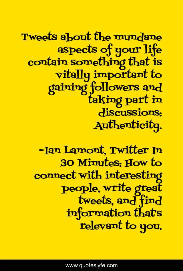 "Ian Lamont, Twitter In 30 Minutes: How to connect with interesting people, write great tweets, and find information that's relevant to you. Quotes." Quoteslyfe.com, 2025. Fri. 05 Dec. 2025. <https://www.quoteslyfe.com/quote/Tweets-about-the-mundane-aspects-of-your-236965>.