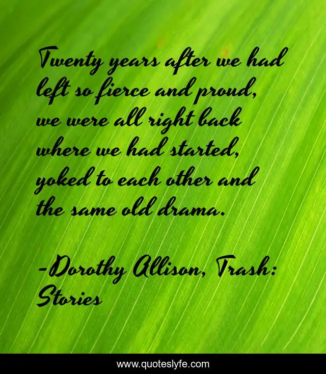 This page presents the quote "Twenty years after we had left so fierce and proud, we were all right back where we had started, yoked to each other and the same old drama.". Author of this quote is Dorothy Allison, Trash: Stories. .
