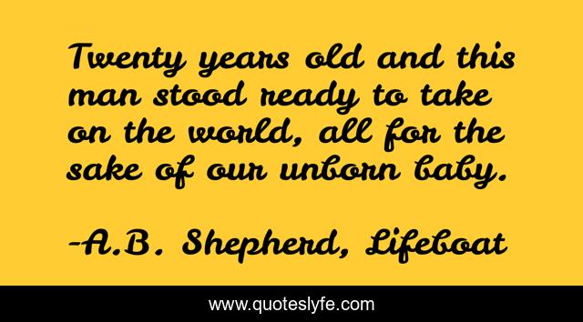 This page presents the quote "Twenty years old and this man stood ready to take on the world, all for the sake of our unborn baby.". Author of this quote is A.B. Shepherd, Lifeboat. This quote is about life-and-living, life-experience, life-changing,.