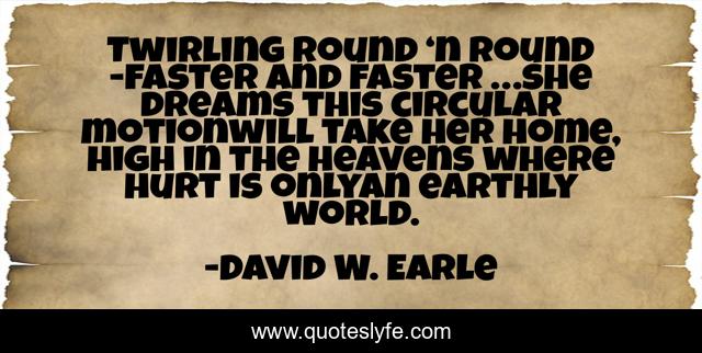 This page presents the quote "Twirling round ‘n round -faster and faster …she dreams this circular motionwill take her home, high in the heavens where hurt is onlyan earthly world.". Author of this quote is David W. Earle. This quote is about spirituality, pain, recovery, change, steps,.