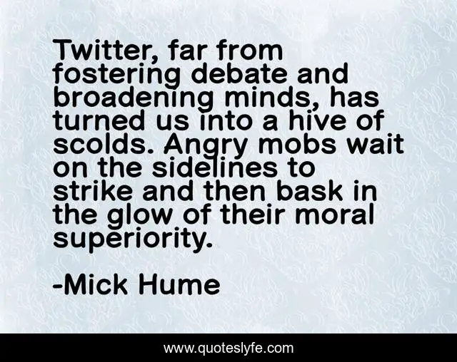 This page presents the quote "Twitter, far from fostering debate and broadening minds, has turned us into a hive of scolds. Angry mobs wait on the sidelines to strike and then bask in the glow of their moral superiority.". Author of this quote is Mick Hume. This quote is about free-speech, social-media, twitter,.
