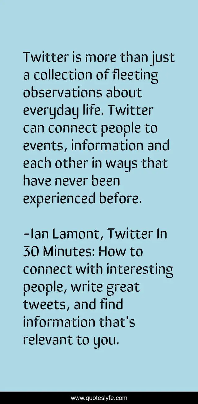 "Ian Lamont, Twitter In 30 Minutes: How to connect with interesting people, write great tweets, and find information that's relevant to you. Quotes." Quoteslyfe.com, 2025. Fri. 05 Dec. 2025. <https://www.quoteslyfe.com/quote/Twitter-is-more-than-just-a-collection-236964>.