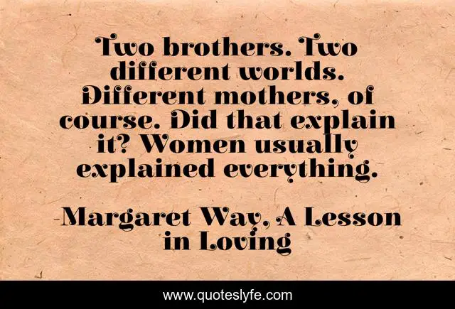 This page presents the quote "Two brothers. Two different worlds. Different mothers, of course. Did that explain it? Women usually explained everything.". Author of this quote is Margaret Way, A Lesson in Loving. This quote is about mother, different, difference, brothers, women,.