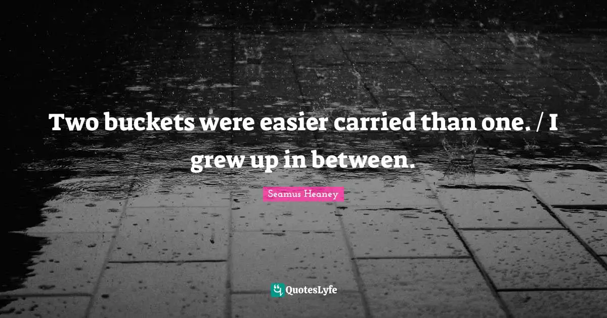 This page presents the quote "Two buckets were easier carried than one. / I grew up in between.". Author of this quote is Seamus Heaney. This quote is about grew up, buckets, two, easier,.