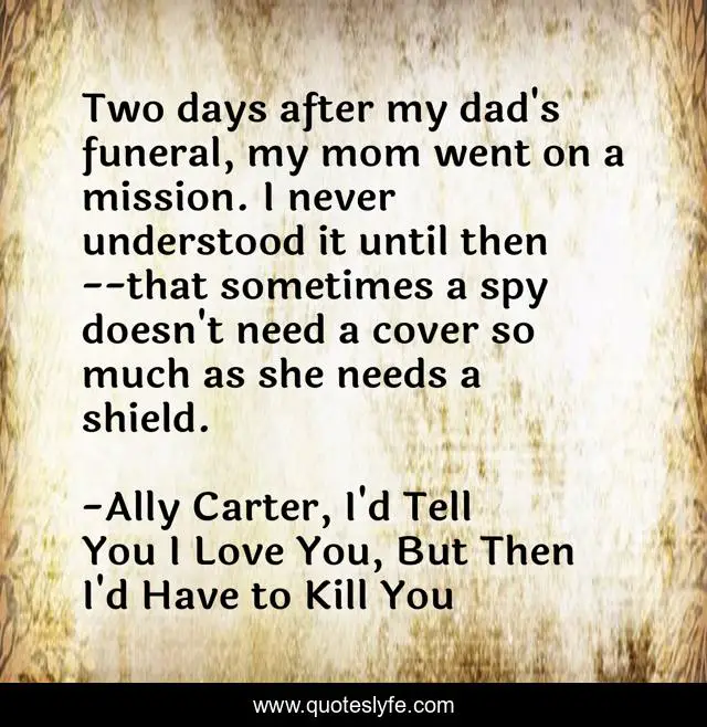 This page presents the quote "Two days after my dad's funeral, my mom went on a mission. I never understood it until then--that sometimes a spy doesn't need a cover so much as she needs a shield.". Author of this quote is Ally Carter, I'd Tell You I Love You, But Then I'd Have to Kill You. This quote is about broken-heart, romance-funny, love, hurt, breaking-up, affection,.