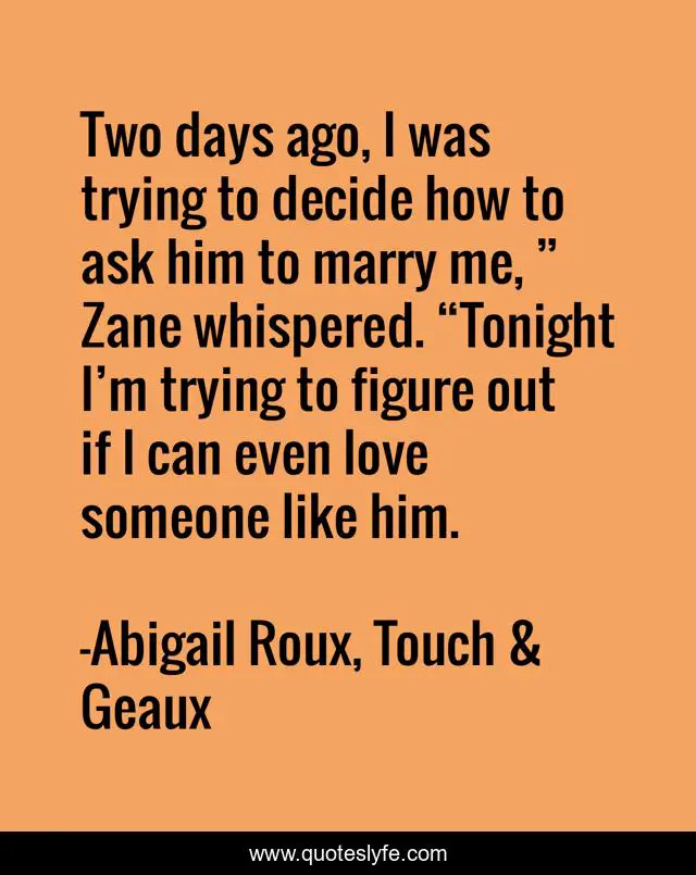 This page presents the quote "Two days ago, I was trying to decide how to ask him to marry me, ” Zane whispered. “Tonight I’m trying to figure out if I can even love someone like him.". Author of this quote is Abigail Roux, Touch & Geaux. This quote is about betrayal, proposal, heartbreak, love, affection,.
