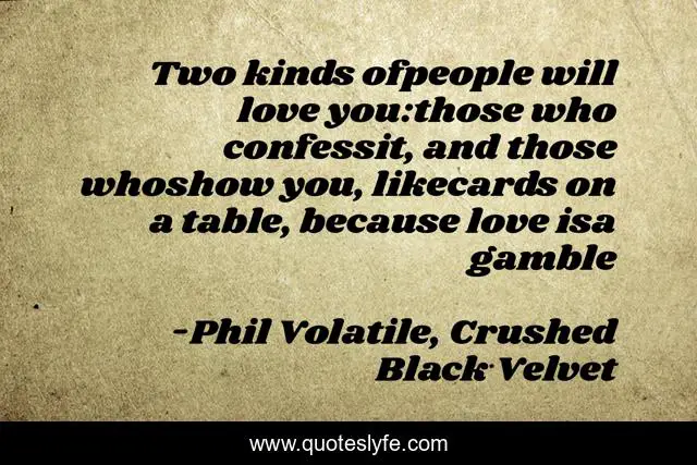 This page presents the quote "Two kinds ofpeople will love you:those who confessit, and those whoshow you, likecards on a table, because love isa gamble". Author of this quote is Phil Volatile, Crushed Black Velvet. This quote is about relationships, life, love, poetry, affection,.