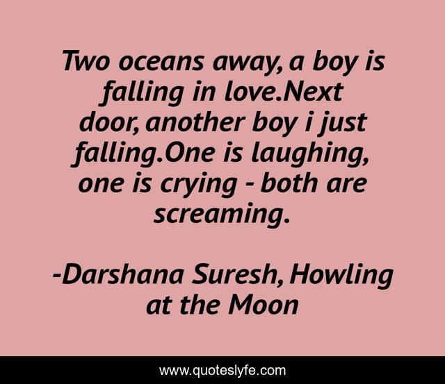 This page presents the quote "Two oceans away, a boy is falling in love.Next door, another boy i just falling.One is laughing, one is crying - both are screaming.". Author of this quote is Darshana Suresh, Howling at the Moon. This quote is about falling-in-love, love, affection,.