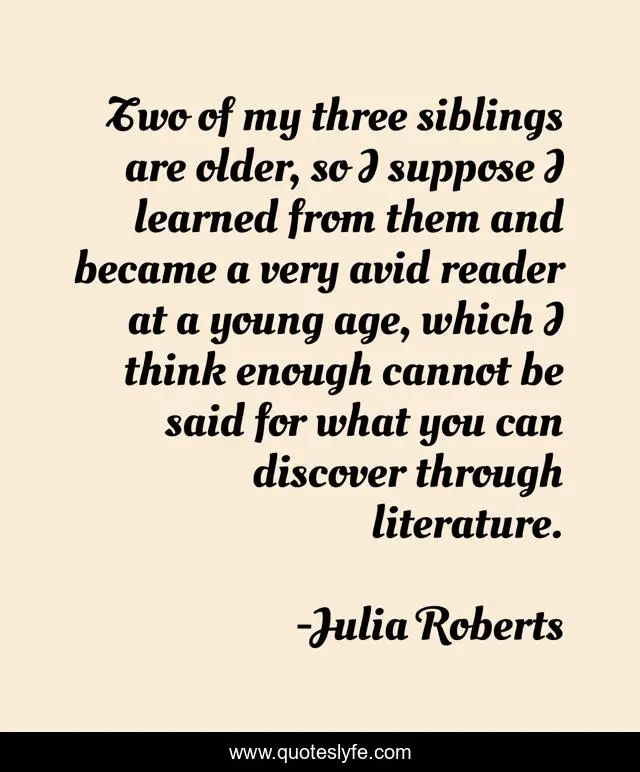 This page presents the quote "Two of my three siblings are older, so I suppose I learned from them and became a very avid reader at a young age, which I think enough cannot be said for what you can discover through literature.". Author of this quote is Julia Roberts. This quote is about literature, think,.