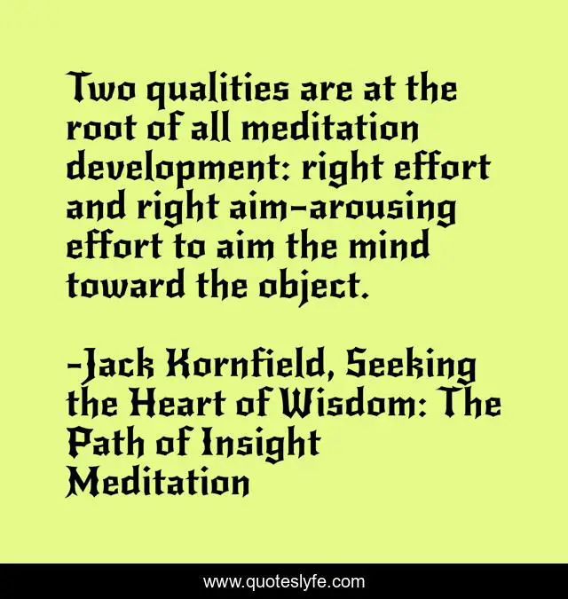 This page presents the quote "Two qualities are at the root of all meditation development: right effort and right aim—arousing effort to aim the mind toward the object.". Author of this quote is Jack Kornfield, Seeking the Heart of Wisdom: The Path of Insight Meditation. .