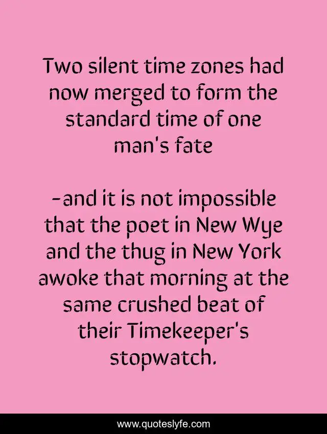 "and it is not impossible that the poet in New Wye and the thug in New York awoke that morning at the same crushed beat of their Timekeeper's stopwatch. Quotes." Quoteslyfe.com, 2025. Mon. 08 Dec. 2025. <https://www.quoteslyfe.com/quote/Two-silent-time-zones-had-now-merged-107607>.