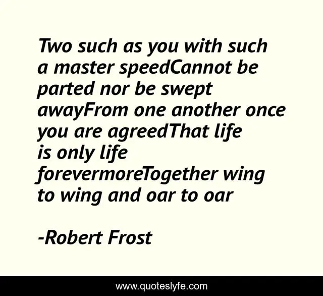 This page presents the quote "Two such as you with such a master speedCannot be parted nor be swept awayFrom one another once you are agreedThat life is only life forevermoreTogether wing to wing and oar to oar". Author of this quote is Robert Frost. This quote is about master-speed, robert-frost, poetry,.