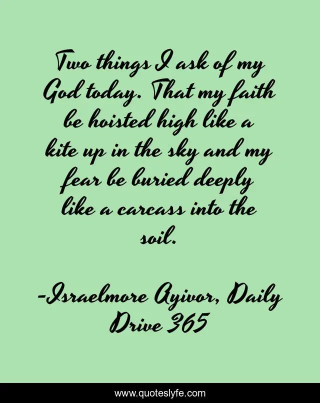 This page presents the quote "Two things I ask of my God today. That my faith be hoisted high like a kite up in the sky and my fear be buried deeply like a carcass into the soil.". Author of this quote is Israelmore Ayivor, Daily Drive 365. This quote is about kite, soil, buried, prayer, god-will-make-a-way, faith, food-for-thought, afraid, sky,.