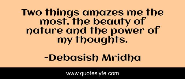 This page presents the quote "Two things amazes me the most, the beauty of nature and the power of my thoughts.". Author of this quote is Debasish Mridha. This quote is about power-of-my-thoughts, philosophy, debasish-mridha, beauty-of-nature, things-amaze-me, quotes, inspirational, enthusiasm, debasish-mridha-m-d,.