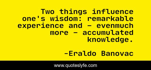 This page presents the quote "Two things influence one's wisdom: remarkable experience and – evenmuch more – accumulated knowledge.". Author of this quote is Eraldo Banovac. This quote is about knowledge, experience, wisdom,.