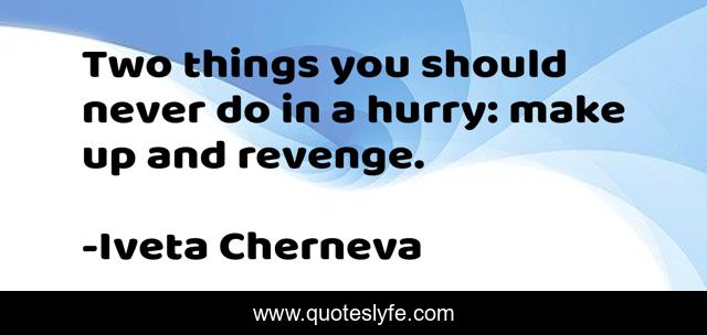 This page presents the quote "Two things you should never do in a hurry: make up and revenge.". Author of this quote is Iveta Cherneva. This quote is about hurry, revenge,.