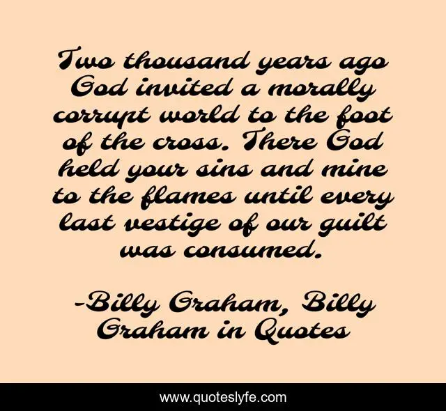 This page presents the quote "Two thousand years ago God invited a morally corrupt world to the foot of the cross. There God held your sins and mine to the flames until every last vestige of our guilt was consumed.". Author of this quote is Billy Graham, Billy Graham in Quotes. This quote is about cross, billy-graham,.
