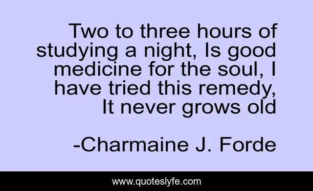 This page presents the quote "Two to three hours of studying a night, Is good medicine for the soul, I have tried this remedy, It never grows old". Author of this quote is Charmaine J. Forde. This quote is about old, studying, soul, three, hours, remedy, medicine,.