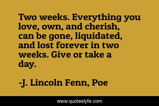 This page presents the quote "Two weeks. Everything you love, own, and cherish, can be gone, liquidated, and lost forever in two weeks. Give or take a day.". Author of this quote is J. Lincoln Fenn, Poe. This quote is about death-and-dying, death-of-a-loved-one,.