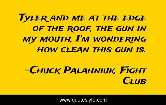 This page presents the quote "Tyler and me at the edge of the roof, the gun in my mouth, I'm wondering how clean this gun is.". Author of this quote is Chuck Palahniuk, Fight Club. This quote is about club, tyler-durden, guns, fight,.