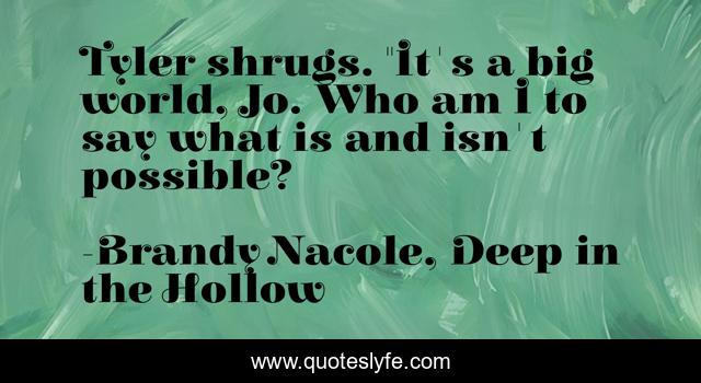 "Brandy Nacole, Deep in the Hollow Quotes." Quoteslyfe.com, 2025. Mon. 08 Dec. 2025. <https://www.quoteslyfe.com/quote/Tyler-shrugs-It-s-a-big-world-93661>.