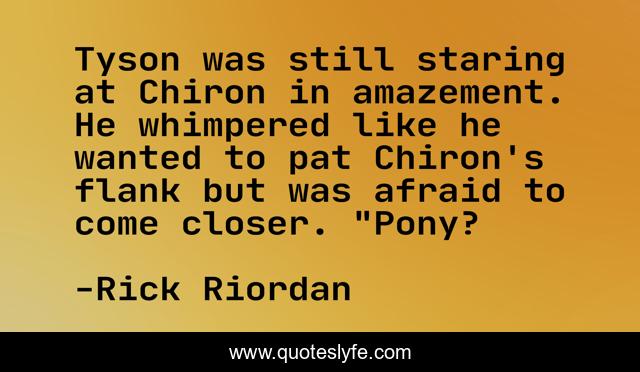 This page presents the quote "Tyson was still staring at Chiron in amazement. He whimpered like he wanted to pat Chiron's flank but was afraid to come closer. "Pony?". Author of this quote is Rick Riordan. This quote is about humor, percy-jackson,.