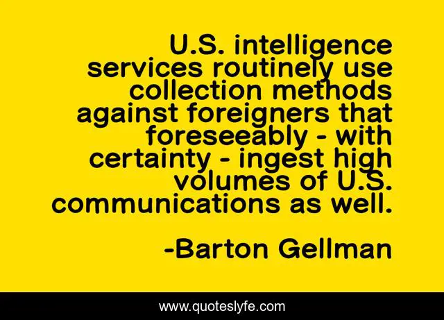 This page presents the quote "U.S. intelligence services routinely use collection methods against foreigners that foreseeably - with certainty - ingest high volumes of U.S. communications as well.". Author of this quote is Barton Gellman. This quote is about high, certainty, well,.