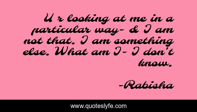 This page presents the quote "U r looking at me in a particular way- & I am not that. I am something else. What am I- I don't know.". Author of this quote is Rabisha. .