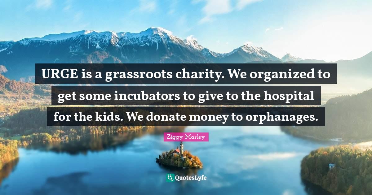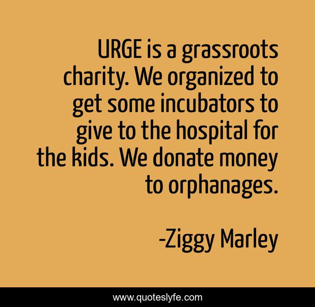 This page presents the quote "URGE is a grassroots charity. We organized to get some incubators to give to the hospital for the kids. We donate money to orphanages.". Author of this quote is Ziggy Marley. This quote is about hospital, kids, charity,.