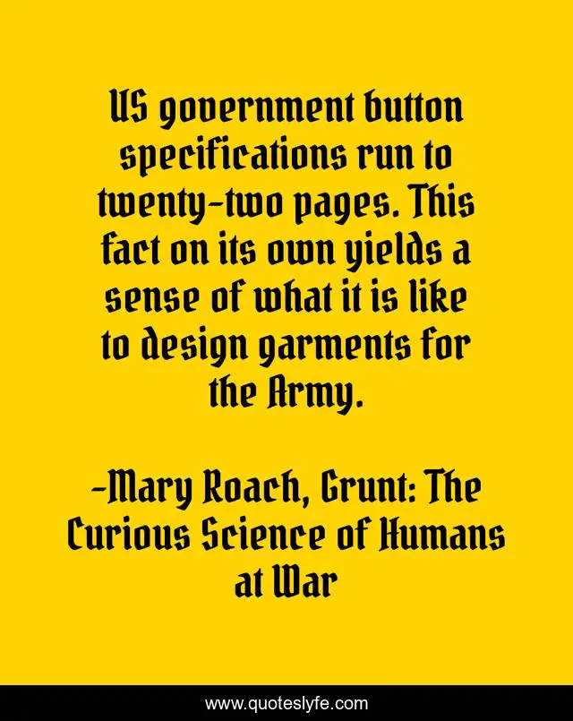 "Mary Roach, Grunt: The Curious Science of Humans at War Quotes." Quoteslyfe.com, 2025. Fri. 05 Dec. 2025. <https://www.quoteslyfe.com/quote/US-government-button-specifications-run-to-twenty-56337>.