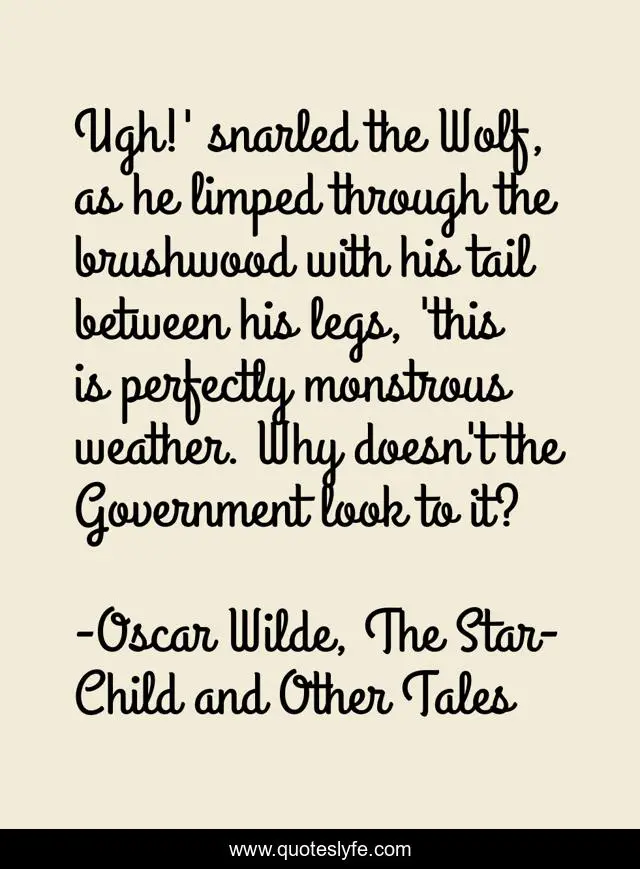 This page presents the quote "Ugh!' snarled the Wolf, as he limped through the brushwood with his tail between his legs, 'this is perfectly monstrous weather. Why doesn't the Government look to it?". Author of this quote is Oscar Wilde, The Star-Child and Other Tales. This quote is about animals, humor, joke,.