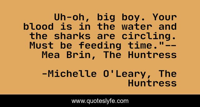 This page presents the quote "Uh-oh, big boy. Your blood is in the water and the sharks are circling. Must be feeding time."--Mea Brin, The Huntress". Author of this quote is Michelle O'Leary, The Huntress. This quote is about the-huntress, michelle-o-leary, science-fiction, fiction, romance, scifi,.