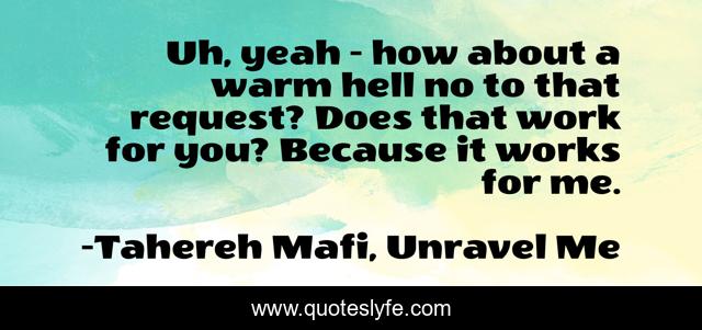 This page presents the quote "Uh, yeah - how about a warm hell no to that request? Does that work for you? Because it works for me.". Author of this quote is Tahereh Mafi, Unravel Me. This quote is about sarcasm, humor,.