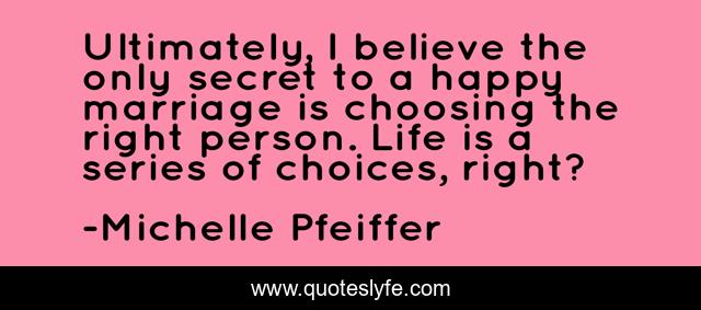 This page presents the quote "Ultimately, I believe the only secret to a happy marriage is choosing the right person. Life is a series of choices, right?". Author of this quote is Michelle Pfeiffer. This quote is about life, believe, happy,.