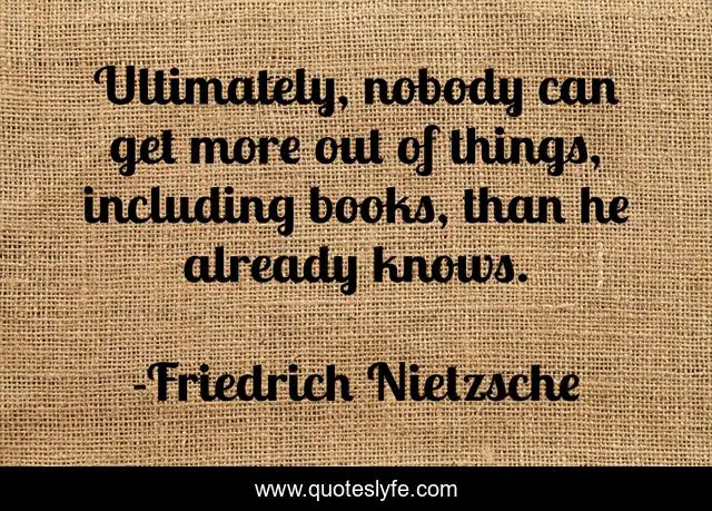 This page presents the quote "Ultimately, nobody can get more out of things, including books, than he already knows.". Author of this quote is Friedrich Nietzsche. This quote is about nietzche, books, knowledge, reading,.